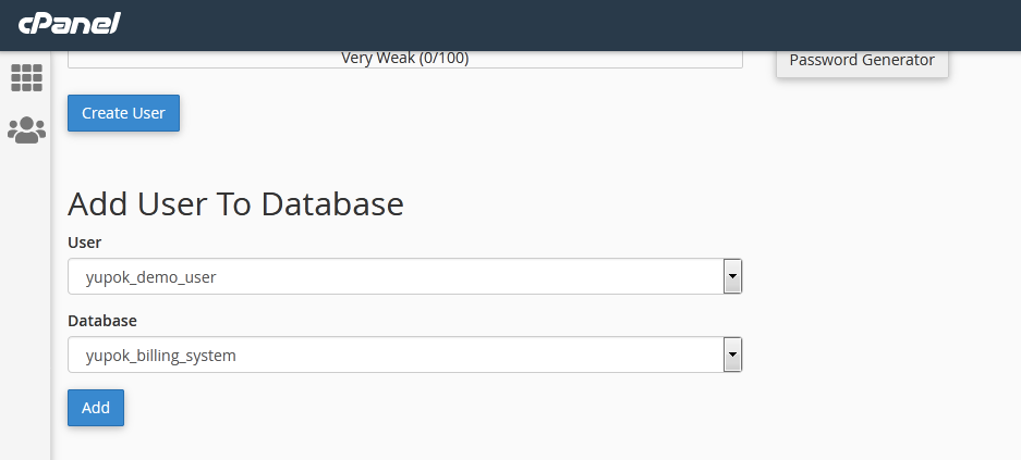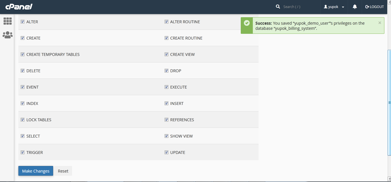 - Step 7: A message appears, You have successfully created a MySQL user named "yupok_demo_user". It means Your Database USERName : yupok_demo_user , Note : yupok_ prefix is demo, your website automatic added Prefix to your Username.So copy that name that is your Original Database Username.